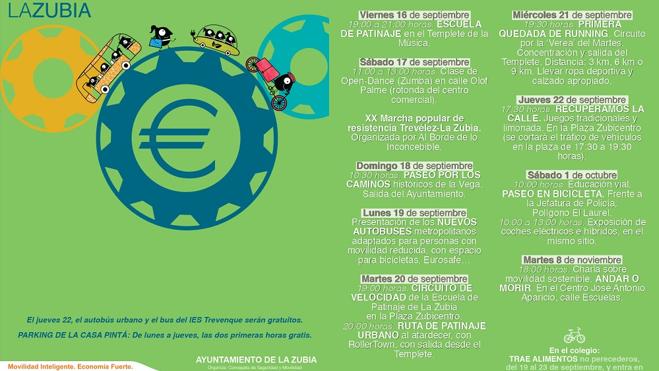 La Concejalía de Seguridad y Movilidad del Ayuntamiento de La Zubia ha organizado una intensa programación de actividades, con motivo de la Semana Europea de ... la Movilidad, que pretende concienciar sobre la necesidad de buscar alternativas a los desplazamientos en coche en pueblos y ciudades. Con la colaboración de otras áreas municipales y clubes deportivos, las jornadas arrancan este mismo viernes 16 de septiembre, con una exhibición de la escuela municipal de patinaje, a las siete de la tarde en el Templete.