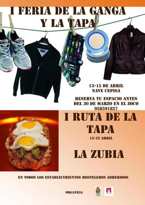 La Zubia será escenario del viernes 13 al domingo 22 de abril de una importante muestra comercial y de restauración destinada a revitalizar la economía de la localidad y del resto de los pueblos del área metropolitana granadina. Dar un fuerte impulso al comercio es el objetivo de esta iniciativa organizada desde las concejalías de Comercio y Turismo del Ayuntamiento zubiense. La I Feria de la Ganga y la Tapa tendrá lugar del 13 al 15 de abril en las instalaciones de la nave Cepisa de La Zubia. La I Ruta de la Tapa se celebrará del 15 al 22 de abril en cada uno de los establecimientos que se adhieran a la iniciativa.