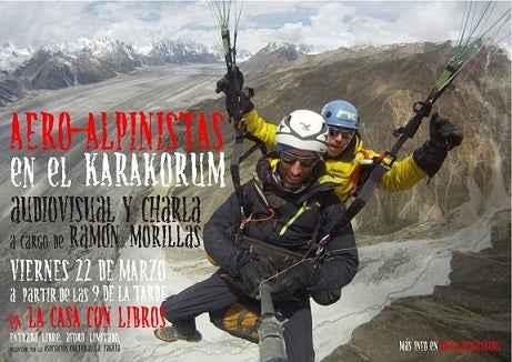La Casa Con Libros presenta la charla y el audivisual de la mano de Ramón Morillas: Aeroalpinistas en el Karakorum. El alpinista Simón Elías y el parapentista Ramón Morillas, apoyados en tierra por Sebastián Álvaro, emprendieron una original y arriesgada expedición combinando vuelo en parapente biplaza y alpinismo en pleno corazón del Karakorumm.