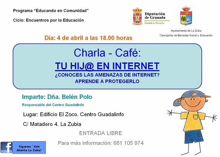 'Educando en comunidad' retoma sus 'Encuentros por la educación' y lo hace con una relevante charla sobre los riesgos que puede presentar internet para ... los niños. En esta ocasión será la responsable del Aula Guadalinfo de La Zubia, Belén Polo, la encargada de asesorar a los padres en el tema del acceso de los contenidos de la red para los menores. Bajo el título 'Tu hij@ en internet. ¿Conoces las amenazas de internet? Aprende a protegerlo', el encuentro reunirá a padres y resto de agentes de la comunidad educativa a las 18:00 horas en el salón de actos del Edificio Zoco, en la calle Matadero 4 de La Zubia.