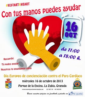 Bajo el lema 'Con tus manos puedes ayudar' se conmemora el Día Europeo de Concienciación contra el Paro Cardiaco el próximo 16 de octubre y ... los miembros de la agrupación de voluntarios de Protección Civil de La Zubia lo conmemoran con un acto en el parque de la Encina en el que explicarán cómo actuar en caso de que alguna persona se encuentre indispuesta. Para intentar dar respuestas a cualquier imprevisto se informará sobre la conducta PAS, sobre una cadena de supervivencia, cómo detectar una PCR ( Parada cardiorrespiratoria) y qué son las maniobras de RCP (Resucitación Cardiopulmonar). El objetivo es que cualquier ciudadanos conozca y sepa poner en práctica los secretos de una reanimación cardiaca, que sepan qué hacer en caso de asistir a una parada cardiaca.
