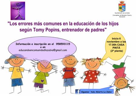 El objetivo con este taller es que los progenitores de La Zubia tomen consciencia de los errores educativos más comunes que se llevan a cabo con la rutina diaria, en un intento de mejorar y fortalecer las relaciones entre padres e hijos y, sobre todo, de que los padres ofrezcan a sus retoños las mejores opciones ante las distintas circunstancias de la vida. La idea es promover relaciones positivas en el hogar a través del respeto mutuo. El horario previsto es los miércoles a las 17:00 horas en la Casá Pintá y estará impartido por Tomas Quirosa, psicólogo del Ayuntamiento de La Zubia. Los interesados solo deben inscribirse, ya que la asistencia es gratuita. Para más información llamar al teléfono: 958593115 o en educandoencomunidadlazubia@gmail.com. Organizado por lasd concejalías de Bienestar Social y Educación el taller empieza el miércoles seis de novimbre a las 17:00 horas en la Casa Pintá.