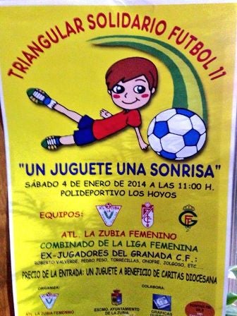 Bajo el lema 'Un juguete una sonrisa' se va a desarrollar el sábado día cuatro de enero entre los equipos Atlético La Zubia Femenino, combinado ... de la liga femenina y exjugadores del Granada Club de Fútbol. Futbolistas de la talla de Roberto Valverde, Torrecillas, Onofre, Jolgoso o Pedro Peso participan en esta iniciativa destinada a recaudar juguetes para Cáritas Diocesana, que lo repartirá entre los niños que lo precisen. Será en el Polideportivo Los Hoyos de La Zubia a las 11.00 horas y la entrada al campo cuesta un juguete.