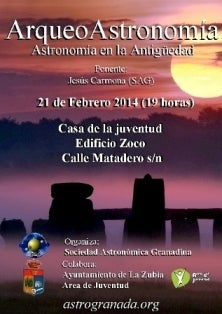 La actividad está organizada por la Sociedad Astronómica Granadina el colaboración con el área de Juventud del Ayuntamiento zubiense. Cada cultura ha plasmado en su ... arte, literatura y arquitectura el modo en que ha mirado a las estrellas. Se entiende por Arqueoastronomía el estudio de restos arqueológicos y de conocimientos relacionados con el estudio del cielo anteriores al inicio de la astronomía moderna, el cual queda marcado con la invención del telescopio hace menos de quinientos años. En los restos arqueológicos y tratados sobre astronomía de épocas como la de la antigua Roma, la Grecia clásica y el antiguo Egipto se detecta una sabiduría sobre el funcionamiento del Cosmos que no deja de sorprender: conceptos que parecen sacados de los laboratorios de la NASA, como las enormes distancias interplanetarias yacen en el seno de la observación astronómica de hace más de dos mil años, mediciones precisas sobre la posición de los astros son la base del trazado de construcciones como Stonehenge, las Pirámides de Gizé o las de Centro América.