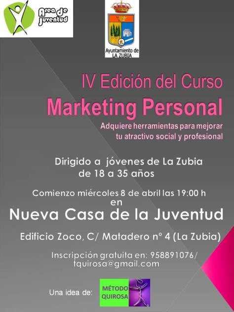 El objetivo con este curso es aprender a construir una huella digital limpia y un curriculum online en perfecto estado, de forma que evidencia la ... marca personal en Internet. Con la IV edición del Curso de Marketing personal se pretende ofrecer a los jóvenes de la localidad, con edades comprendidas entre los 18 y los 35 años, la posibilidad de adquirir las herramientas necesarias para mejorar tu atractivo personal y profesional. Organizado por el área de Juventud del Ayuntamiento zubiense, es una idea de Tomás Quirosa, psicólogo del Ayuntamiento de La Zubia. El curso es gratuito y comienza el ocho de abril a las 19:00 horas en la Casa de la Juventud de La Zubia, ubicada en el edificio Zoco de la Calle Matadero de la localidad. Para hacer la inscripción hay que contactar por teléfono al 958891076 o en tquirosa@gmail.com