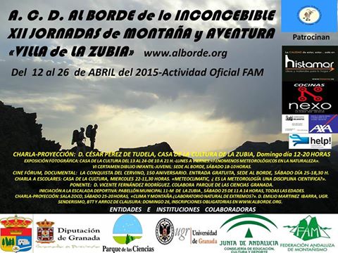 Con esta iniciativa se da el pistoletazo de salida a una nueva edición de las Jornadas de Montaña y Aventura de La Zubia, que se celebra del 12 al 26 de abril. Las Jornadas de Montaña sirven de excusa asimismo para mostrar las obras del V Certamen de Fotografía de la asociación organizadora. Del 13 al 24 de abril el Centro Cultural Carlos Cano acogerá una exposición con 'Fenómenos Meteorológicos' como principales protagonistas. Los más pequeños no permanecen ajenos a la programación de las Jornadas, que una vez más convoca a los niños-as zubienses en su VI Certamen de Dibujo Infantil-Juvenil 'Naturaleza y Montaña' que se celebrará en la sede de la Asociación Al Borde el sábado 18 de abril a las 11:00 horas. Por la tarde, el programa incluye la celebración de un cine fórum con la proyección del documental "La conquista del Cervino, 150 aniversario", en la sede del club Al Borde y con entrada gratuita. Uno de los objetivos de las Jornadas, cuya inauguración corre a cargo de la alcaldesa de La Zubia, Inmaculada Hernández, es la transmisión de los valores del deporte y la naturaleza al público en general, por lo que las actividades propuestas llegan hasta los centros escolares de la localidad, a cuyos alumnos invita a la charla proyección 'Meteoclimatic. ¿Es la meteorología una modalidad científica?', a cargo de Vicente Fernández Rodríguez. En esta actividad, Al Borde cuenta con la colaboración del Parque de las Ciencias de Granada con la realización de experimentos en vivo.