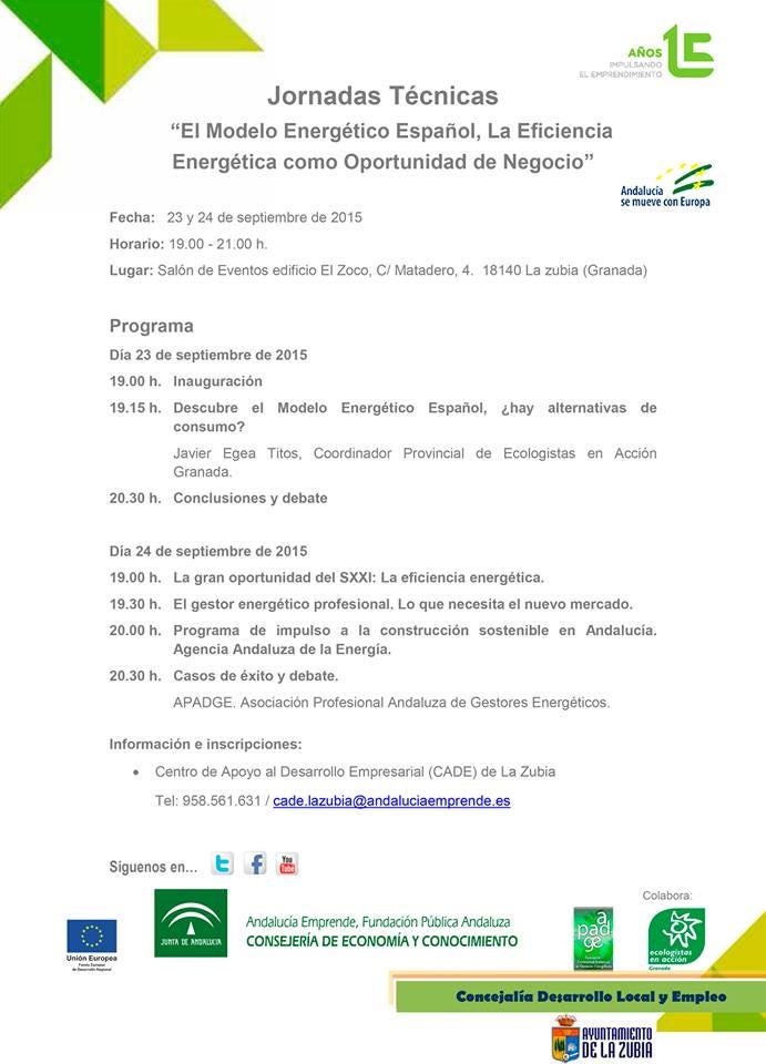 'El modelo energético español, la eficiencia energética como oportunidad de negocio' es el título de las jornadas que se van a desarrollar los días ... 23 y 24 de septiembre. La programación comienza con la ponencia a cargo de Javier de Egea Titos, coordinador provincial de Ecologistas en Acción de Granada. La inauguración es a las 19:00 horas. El 24 de septiembre se va a hablar sobre 'La gran oportunidad del siglo XXI: La eficiencia energética'. Le sigue otra charla sobre 'El gestor energético profesional. Lo que necesita el nuevo mercado' y 'Programa de impulso a la construcción sostenible en Andalucía. Agencia Andaluza de la Energía'. A las 20:30, comenzará el debate. A cargo de APADGE, Asociación Profesional Andaluza de Gestores Energéticos. Los interesados pueden informarse e inscribirse en el Centro de Apoyo al Desarrollo Empresarial (CADE) de La Zubia; o en el teléfono: 958561631/cade.lazubia@andaluciaemprende.es. Está organizado por la Comunidad Europea y la Consejería de Economía y Conocimiento de la Junta de Andalucía en colaboración con la concejalía de Desarrollo Local y Empleo del Ayuntamiento de La Zubia.
