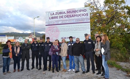 El alcalde de La Zubia, Antonio Molina, presentó ayer junto a parte de su equipo de gobierno, integrado por Ganemos y PSOE, representantes de Stop Desahucios, y el técnico responsable de la Oficina Municipal de Vivienda, una pancarta informativa para recordar a vecinos y visitantes que La Zubia es un municipio libre de desahucios.