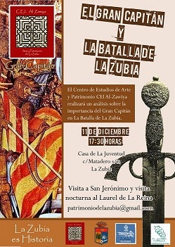 Bajo el título 'El Gran Capitán y la Batalla de La Zubia', pretenden demostrar las peripecias del noble militar y de la Reina Isabel La ... Católica y su relación con la batalla que tuvo lugar en la localidad. Una iniciativa para desentrañar la realidad de lo acontecido en la batalla «donde abunda la leyenda». Como explica Javier Peregrina, lo que se pretende es sacar a la luz las conclusiones de sus investigaciones, que demuestran, a juicio de los estudiosos, que lo acontecido en la Batalla de La Zubia influyó en la guerra de la Reconquista de Granada. Desde el CEI Al-Zawiya consideran que la razón por la que la Reina Isabel la Católica visitó La Zubia fue para estudiar una táctica que le permitiera terminar con la guerra. El programa comienza el 11 de diciembre a las 17:30 horas en la Casa de la Juventud. El presidente del CEI Al-Zawiya, Antonio Buendía, hablará sobre la personalidad de Gonzalo Fernández de Córdoba durante la Guerra de Granada y su participación en la Batalla de La Zubia, con las aportaciones de Beatriz Cano, Javier Peregrina, Alberto M. Quirantes e Irene López. Jesús Salas y María José Luis lo harán a su vez sobre San Jerónimo y el Retablo del Gran Capitán, a lo que se sumarán las lecturas de la mano de Rosa Gamero. Tienen previsto, asimismo, una vista nocturna al Laurel de La Reina y dos guiadas a San Jerónimo. Una el sábado 12 de diciembre a las 16:30 horas y otra el 19 a las 11:00 horas. Asimismo y de forma paralela, se va a llevar a cabo un taller para niños de 3 a 10 años, donde se les va a hablar sobre la Batalla de La Zubia, contada como un cuento. Así como un taller de sombras chinas y un espectáculo de sombras chinas para explicar a los pequeños la Batalla de La Zubia.